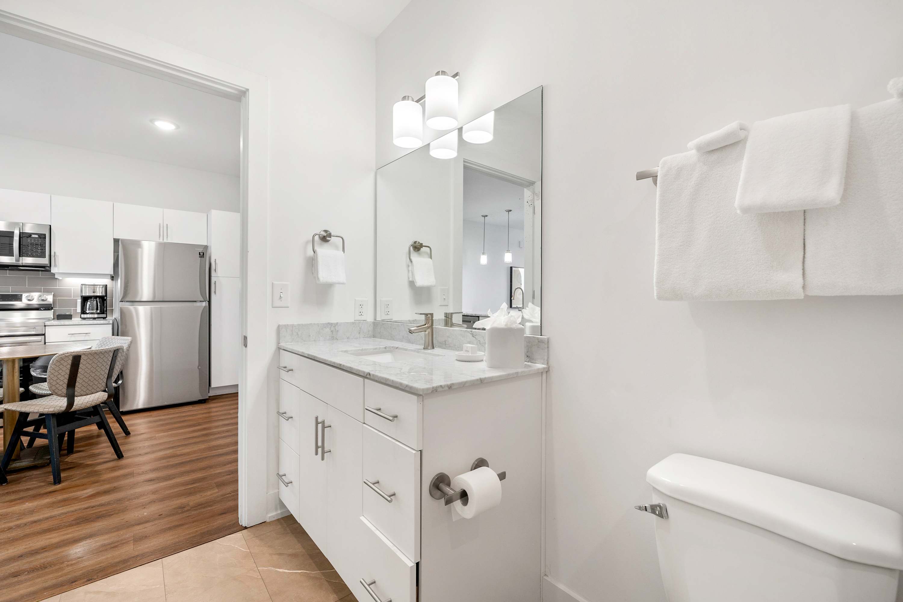 The open-concept living area continues with a fully-equipped kitchen and dining area, perfect for preparing and enjoying meals with your loved ones. The kitchen boasts an upscale contemporary design with spacious countertops, a central kitchen bar, and modern amenities, providing everything you need to create delicious dishes.